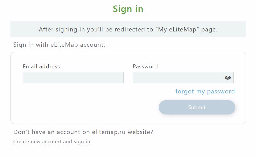 In the appeared 'Create eLiteMap account' form fill in all the required fields and press 'Create new account and sign in' button.